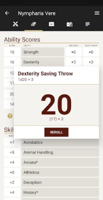 All of your stats and attacks can be rolled with a tap of a button. Also included is dice calculator that allows you to input a custom roll. Need to roll 1d20 + 6d9 + Constitution modifier? Fight Club has what you need.