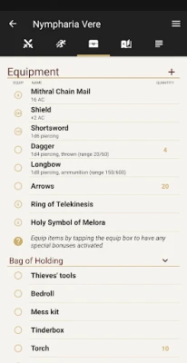 Keep a list of all of your equipment and loot. All of your armor and weapons can be equipped and unequipped and with the tap of a button and stats, like armor class, will automatically change to reflect your current gear.