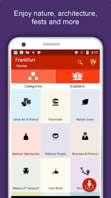 Apart from this, Frankfurt Travel & Explore guides you Why, When and How to visit various places in Frankfurt with precise location on the detailed Map. There are two ways to explore this app - Category view and EduBank favorite places view. Pin your destinations and get the routes on the Map. Not only this, you can see exactly how the places look like with Street View integrated in this app. The app also has a feature to Rate and write Review/Experience regarding entity(s) through Login. Your Travel experience and rating will help the user community.