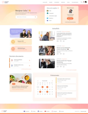 - Communication Interne : Actualités, événements, notifications, quiz, newsletter, widgets (RSS, Instagram), affichage TV