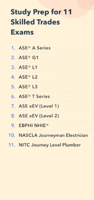 Unlock thousands of Skilled Trades certification exam practice questions for the ASE A Series, ASE xEV (Level 1 & 2), NASCLA Journeyman Electrician, NITC Journey Level Plumber, and more with Pocket Prep, the largest provider of mobile test prep for professional certifications.