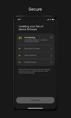 Once your SecuX device is in update mode, you can begin the firmware update process. The SecuX Firmware Update App will automatically start to establish Bluetooth connection, download firmware, verify firmware version and install firmware on your SecuX device.