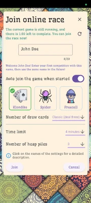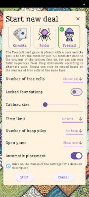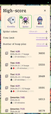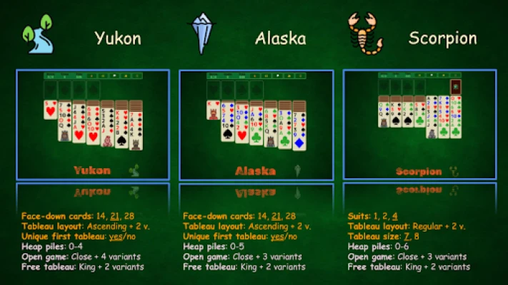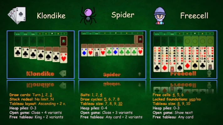 YASG supports all popular game modes such as the number of drawn cards (1, 2 or 3) in case of Klondike, the number of used suits (1, 2 or 4) in Spider, or the number of free cells (4 , 5 or 6) in Freecell. Separate online tournaments are launched for each game mode, so everyone can compete with their favorite settings!